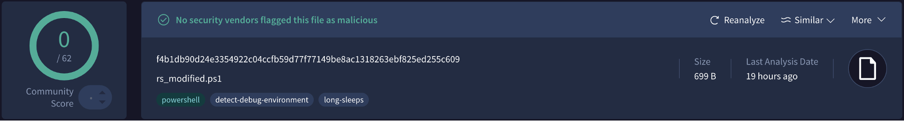 $client.Close()"When I uploaded this unmodified script to VirusTotal, it came back with a 19/62 detection rate and was blocked by Windows 11 Defender. That was expected, but it gave me a good baseline to compare against the obfuscated versions later.